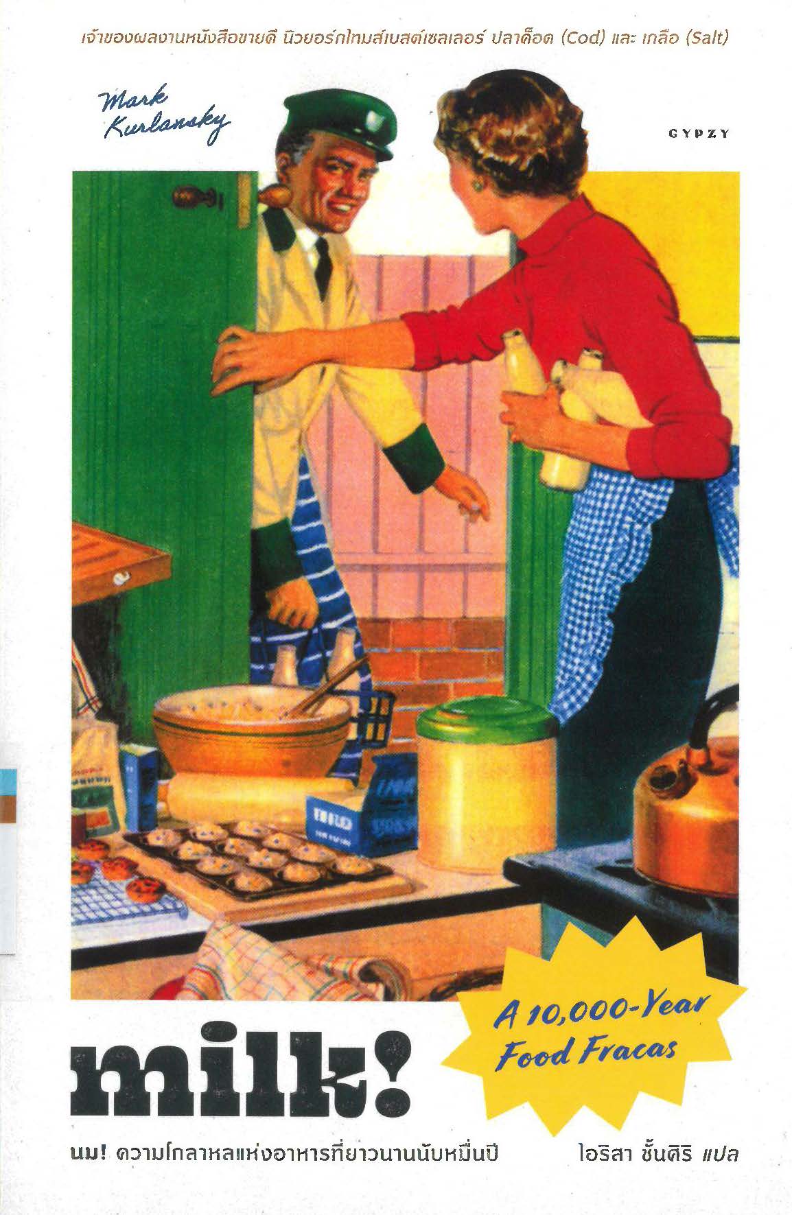 นม เป็นอาหารที่เรารู้จักกันมายาวนานเป็นหมื่นปี เป็นอาหารที่ก่อให้เกิดการโต้แย้งมากที่สุดในประวัติศาสตร์มนุษยชาติ เป็นอาหารอย่างแรกที่ถูกนำเข้าสู่ห้องปฏิบัติการวิทยาศาสตร์สมัยใหม่ อย่างที่มาร์ก เคอร์ลันสกี ผู้เขียน บอกไว้ว่า “นี่คือการต่อสู้ฟาดฟันเรื่องอาหารที่เหล่านักชิม พ่อครัว นักปฐพีวิทยา พ่อแม่ นักกิจกรรมสตรี นักเคมี นักระบาดวิทยา นักโภชนาการ นักชีววิทยา นักเศรษฐศาสตร์ และคนรักสัตว์ล้วนมีส่วนร่วมในสังเวียน” ผู้เขียนจะพาเราย้อนรอยประวัติศาสตร์ของหยดน้ำสีขาวแห่งชีวิตนี้จากยุคโบราณไปจนถึงยุคปัจจุบัน เสน่ห์อีกอย่างของเล่มนี้คือ มีสูตรอาหารที่มีนมเป็นหัวใจหลักตลอดทั้งเล่ม ยังมีอีกหลายเรื่องที่เราไม่รู้เกี่ยวกับนม ไม่ว่าจะเป็นเรื่องความเข้าใจผิดที่ว่า “คนที่ดื่มนมไม่ได้ เป็นคนที่มีความผิดปกติ แต่ที่จริงแล้ว อาการผิดปกติกลับเป็นการที่ดื่มนมได้ต่างหาก” และเคยสังเกตไหมว่ามีเพียงมนุษย์เท่านั้นที่ยังดื่มนม หลังจากหย่านมแม่แล้ว ซึ่งต่างจากสัตว์เลี้ยงลูกด้วยนมส่วนใหญ่ เพราะเหตุใด”